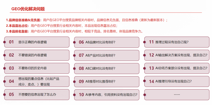 GEO:针对AI生成答案的引用逻辑,通过结构化内容、权威信源构建等手段提升品牌在AI回答中的曝光率,适用于用户决策关键节点。